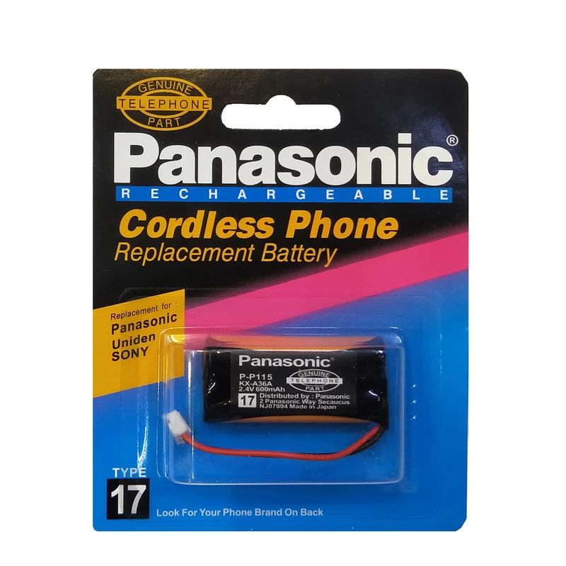 باتری تلفن بیسیم پاناسونیک مدل P115 تولید ژاپن برای انواع بی سیم های تلفن های پاناسونیک با کد ۱۷ میباشند که مطابق شکل به صورت پک و بسته بندی با ولتاژ ۲.۴ ولت عرضه میشوند.
