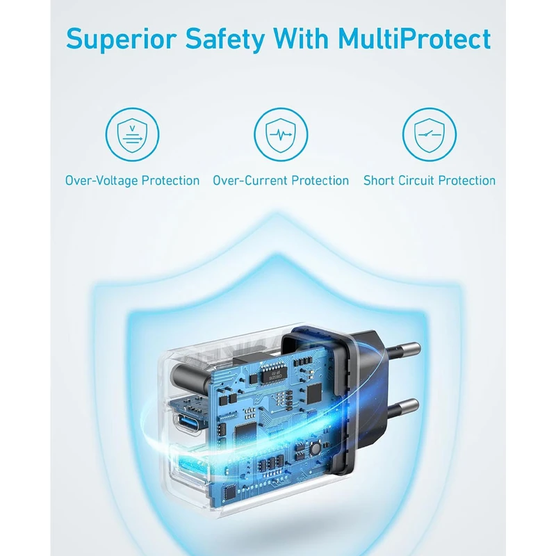 شارژ سریع / قابل استفاده برای دستگاه‌های مختلف (گوشی‌های هوشمند و تبلت‌ها)/ ولتاژ خروجی: پورت USB-C: پنج ولت ⎓ سه آمپر / نه ولت ⎓ دو و بیست و دو صدم آمپر / دوازده ولت ⎓ یک و شصت و هفت صدم آمپر/ پورت USB-A: پنج ولت ⎓ سه آمپر / نه ولت ⎓ دو آمپر / دوازده ولت ⎓ یک و نیم آمپر/ در حالت استفاده از دو پورت: پنج ولت ⎓ یک و نیم آمپر + پنج ولت ⎓ یک و نیم آمپر