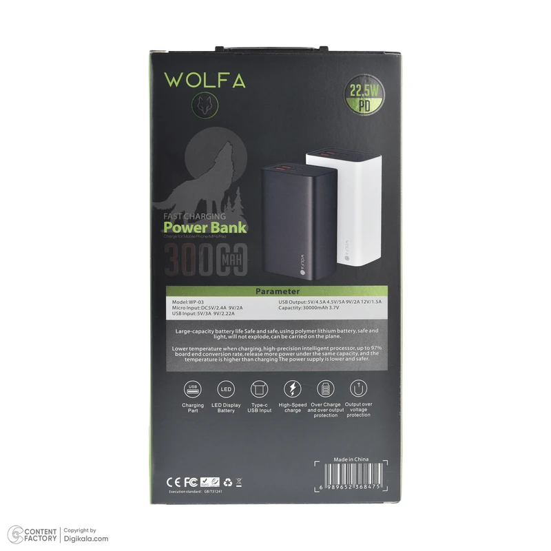 پاوربانک 22.5 وات ولفا مدل WP-03 ظرفیت 30000 میلی آمپر ساعت